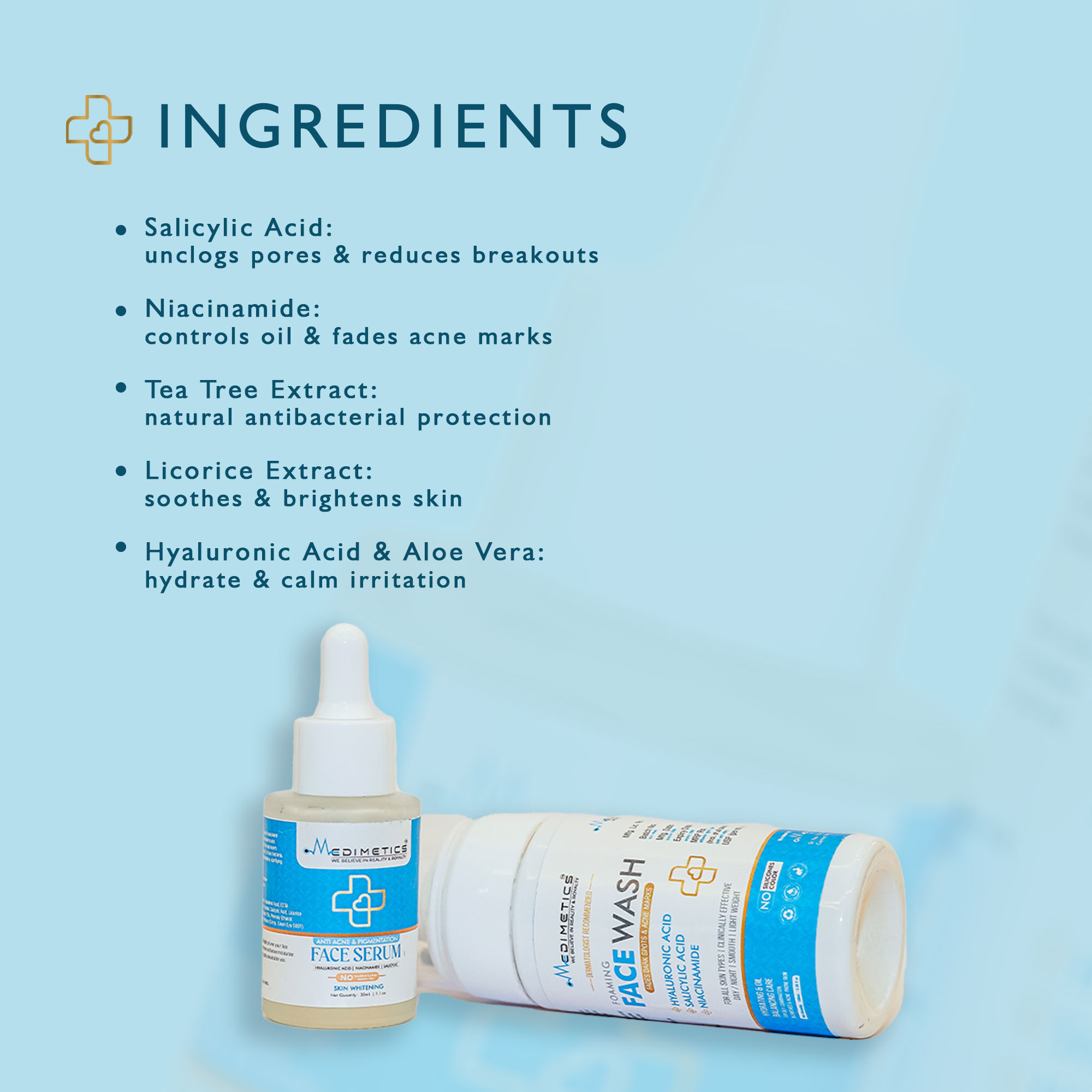 Achieve clear, glowing skin with the Medimetics Anti-Acne Combo. This duo includes a Foaming Face Wash for deep cleansing and an Anti-Acne & Pigmentation Face Serum to target breakouts and dark spots. A powerful combination for a flawless, radiant complexion.